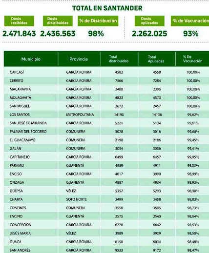 Igualmente resalta que se hayan logrado avances significativos en varios municipios: Enciso, Santa Helena del Opón, Capitanejo, Jesús María, Palmas del Socorro y Guavatá donde se ha  vacunado al 70% de la población contra el COVID, es decir, cuentan con el esquema completo y más del 80% se ha aplicado la primera dosis. Lo anterior, con base en la población registrada por el Departamento Administrativo Nacional de Estadística (Dane).